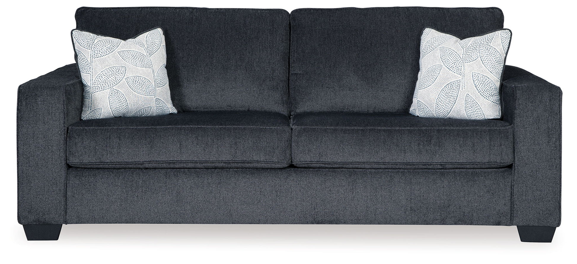 If style is the question, then this sofa is the answer. Sporting clean lines and sleek track arms, the decidedly contemporary profile is enhanced with plump cushioning and a chenille-feel upholstery that's so pleasing to the touch. Sure to play well with so many color schemes, this sofa in richly neutral alloy includes a pair of understated floral pattern pillows for fashionably fresh appeal.