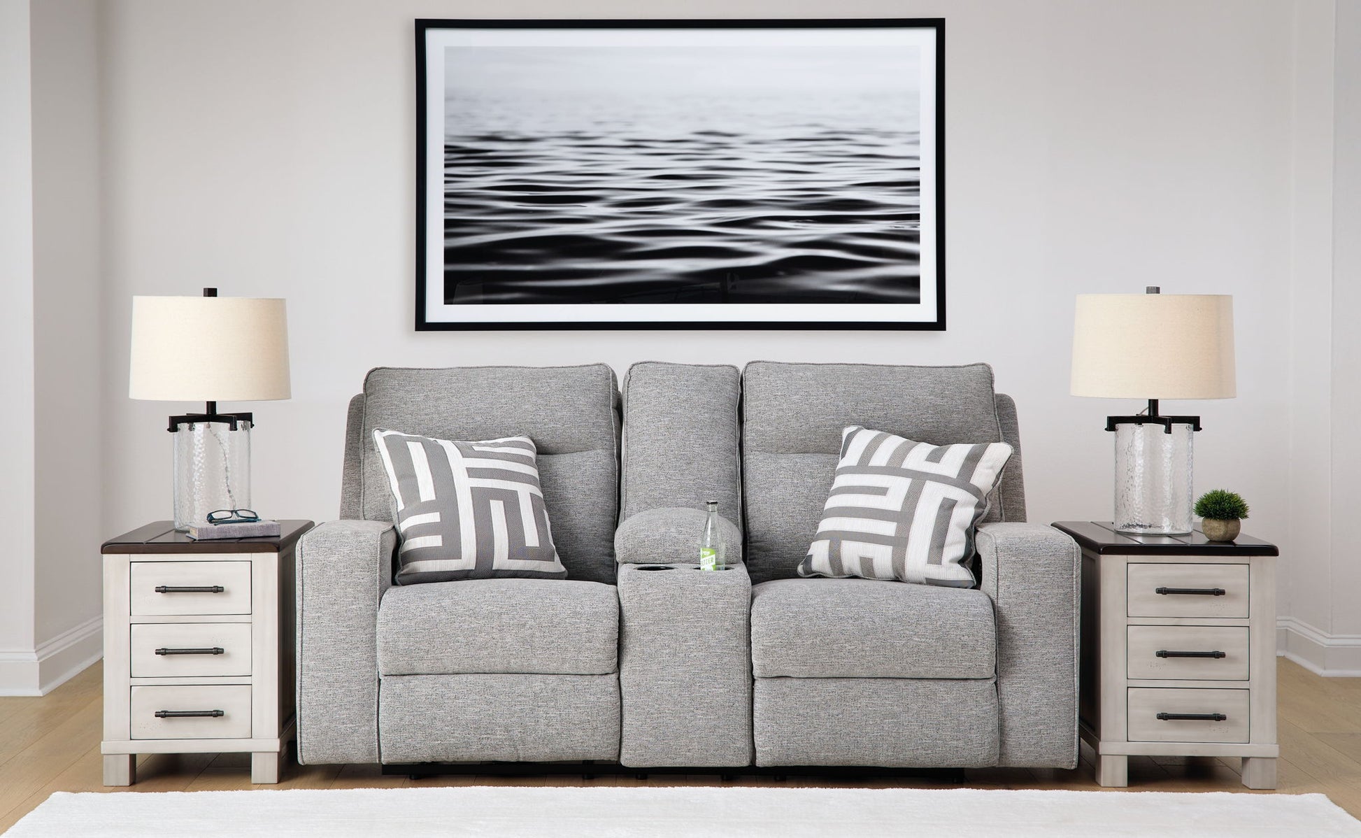 If style is the question, then this power reclining set is the answer. Its clean-lined profile is beautifully contemporary. High-performance fabric and plump cushioning make it so easy to comfortably kick up your heels. The adjustable Easy View™ headrest allows a primo view of the TV, and the extended ottoman provides extra room to really stretch out.