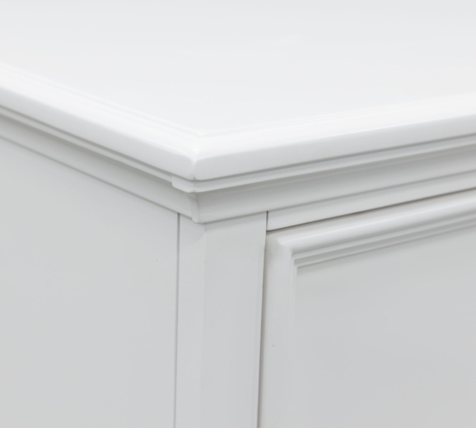 Exuding a timeless casual design, this chest of drawers is ready to define your personal space. It easily adapts to a variety of interiors, combining a clean, contemporary white finish with framed drawer fronts and round metal knobs. Featuring five storage drawers with dovetail construction and traditional tapered feet, this piece is sure to bring elegant simplicity to your bedroom.