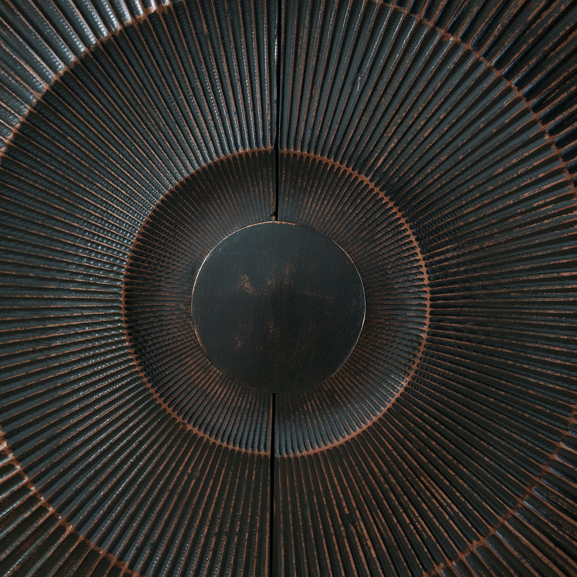 High style is on the rise with this wood accent cabinet. Its stunning doors, graced with a carved sunburst pattern and oversized wood pull, open to reveal two shelves. A distressed black finish adds contemporary flair. Whether this cabinet is accommodating storage needs or hiding clutter, it's truly a showpiece.