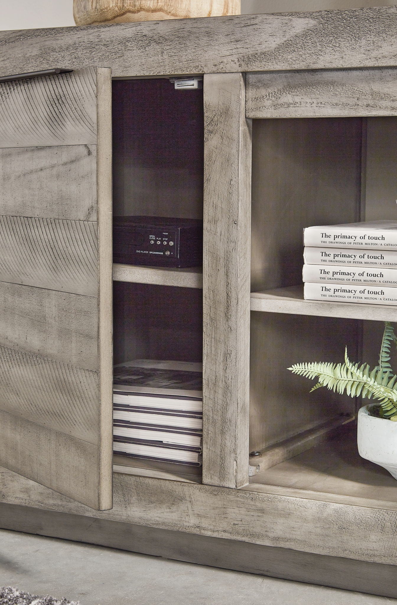 Balancing chic flair with a relaxed sensibility, this extra-large TV stand strikes just the right tone for rustic sophistication. Beautifully clean lines are subtly enhanced with relaxed distressing and saw marks for authentic barn wood character. Adding that much more show-stopping style is an LED fireplace insert that operates with or without heat. The fireplace insert comes with optional faux glass crystals and natural stones, so you can customize the look of the flame bed.
