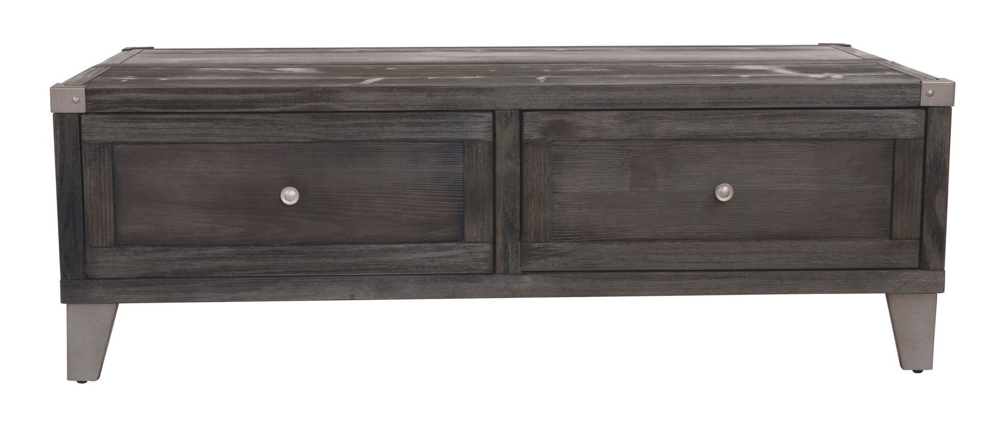 Mixed material lift top table truly elevates rustic-industrial style. Weather-washed pine wood and veneers are contrasted with canted metal legs and corner bracket accents for a uniquely chic merger of earthy beauty and contemporary flair. A handy spring-loaded mechanism brings the tabletop to you, while two drawers with removable storage trays are packed with possibilities.